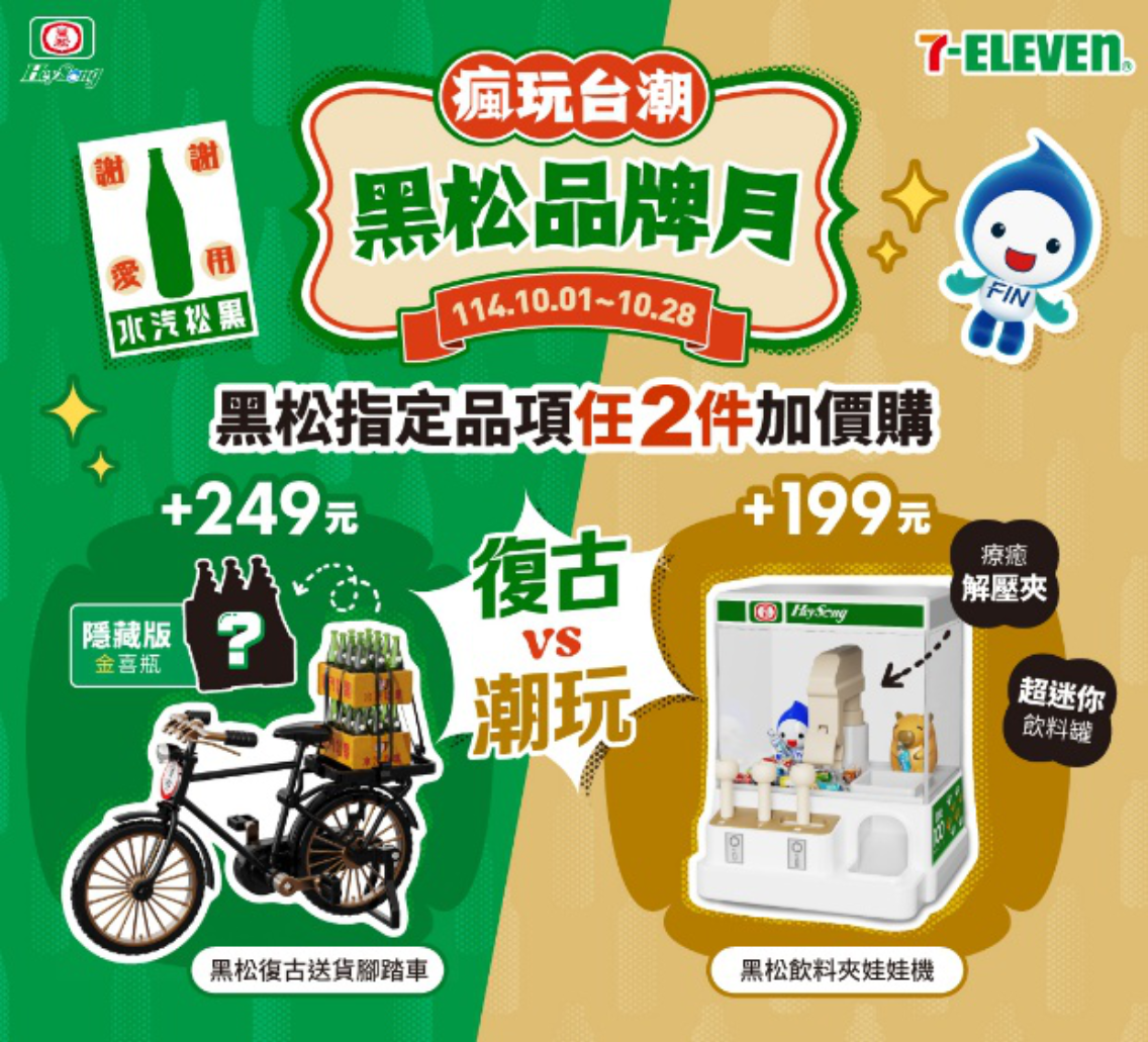 活動期間至7-ELEVEN購買任兩件黑松指定品項,便可加價購將「黑松復古送貨腳踏車」、「黑松飲料夾娃娃機」帶回家。(圖片來源/黑松)