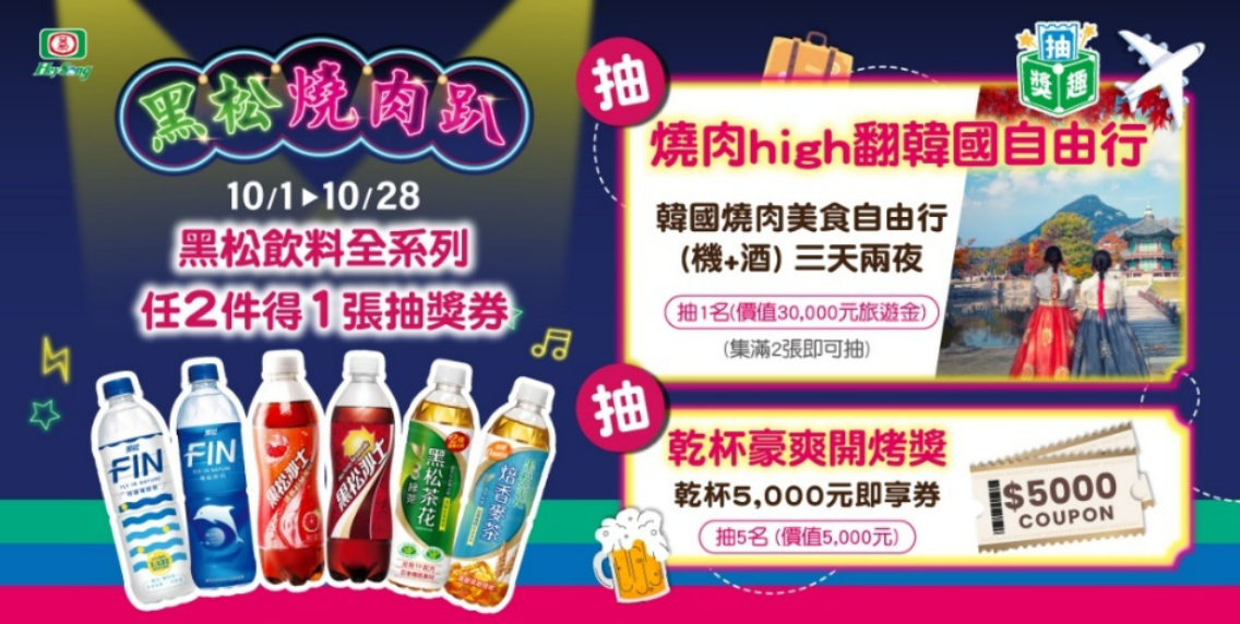 凡參與「全家X黑松燒肉趴」抽獎趣活動,消費者及有機會獲得價值三萬元的韓國三天兩夜之旅及乾杯五千元即享券。(圖片來源/黑松)