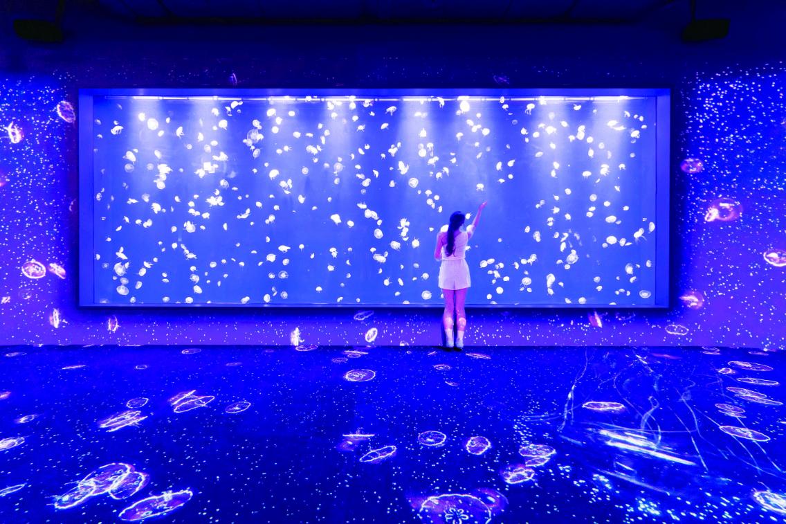 台中海洋館擁有全台規模最大,物種最豐富的「水母主題展區」,寬達8公尺的巨型水母展示缸中,數千隻海月水母靜靜漂浮,搭配360度的沉浸式互動投影,半透明大小水母閃著晶瑩微光,在四面八方徘徊,遊客從頭到腳有如置身深藍色海底世界中,虛實交錯,美麗又夢幻的氛圍令人流連忘返,成為全館人氣最高的打卡熱點。