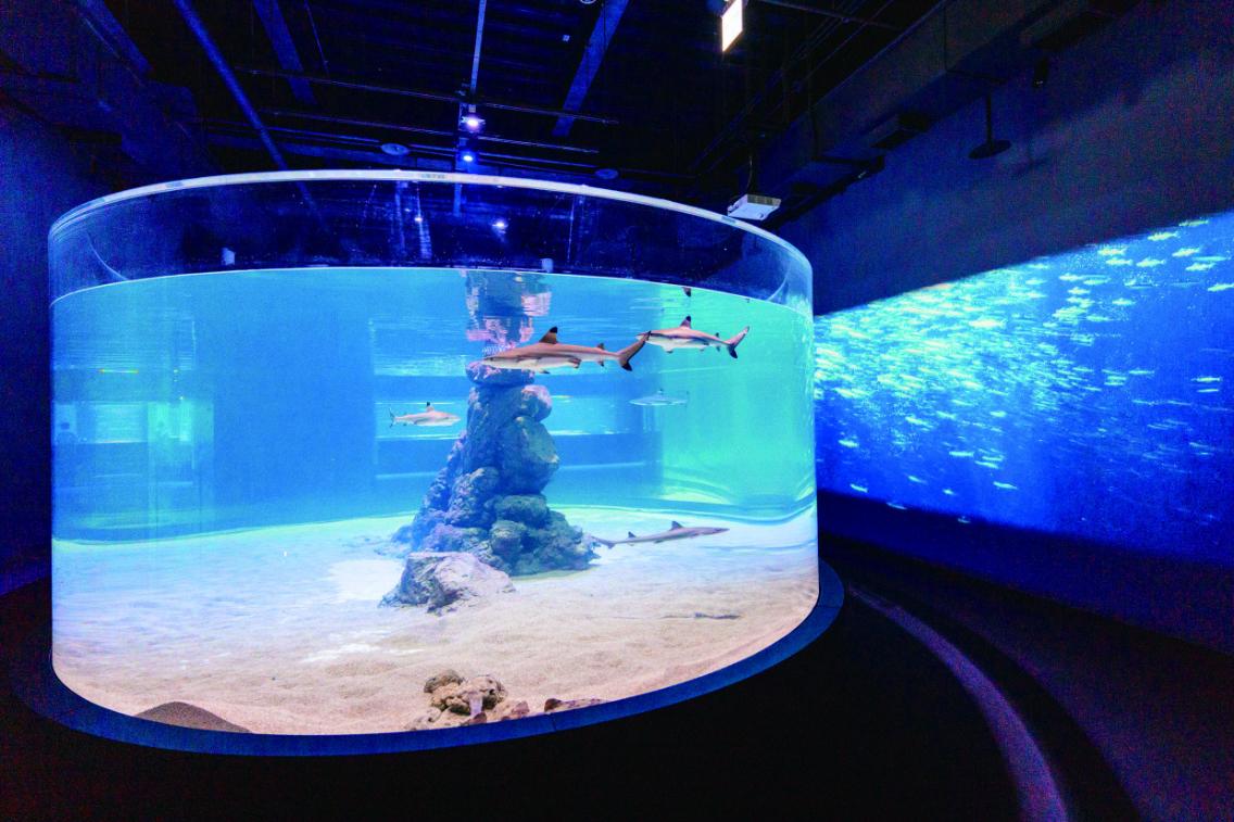 「璀璨珊瑚展示區」設有立體珊瑚展示缸,在神秘藍光籠罩下,美麗繽紛的珊瑚有如寶石閃閃發光,鮮豔的小丑魚穿梭在彩色珊瑚間,氣氛悠閒放鬆。另一頭,「鯊魚虛實展示缸」則以環景展缸搭配投影牆,營造出深海獨有的神秘氣息,遊客能近距離觀察灰貂鯊和條紋狗鯊,欣賞海洋掠食者的傲然英姿。