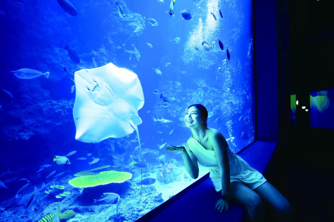 這場海底冒險最後的重頭戲「黑潮之海」,是高7公尺、寬10公尺的巨型大洋缸,匯集溫暖黑潮孕育出的各種生物,超過40種魚類在水中自在穿梭,構成療癒美麗的海洋世界。更精彩的是,海洋館透過投影,將旭日東升、鯨鯊悠遊等場景與大洋缸完美融合,壯闊的聲光效果,彷彿將整座太平洋搬到遊客眼前,令人驚豔萬分。