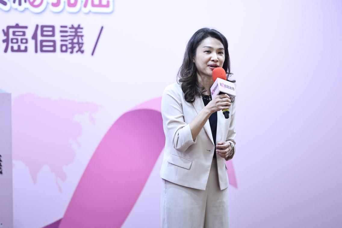 國健署長沈靜芬致詞時表示,今年起已將公費乳癌篩檢放寬至40歲以上、未滿75歲婦女,更補助年輕癌友凍卵,緩解年輕病友的生育壓力,呼籲符合篩檢資格的民眾定期篩檢。