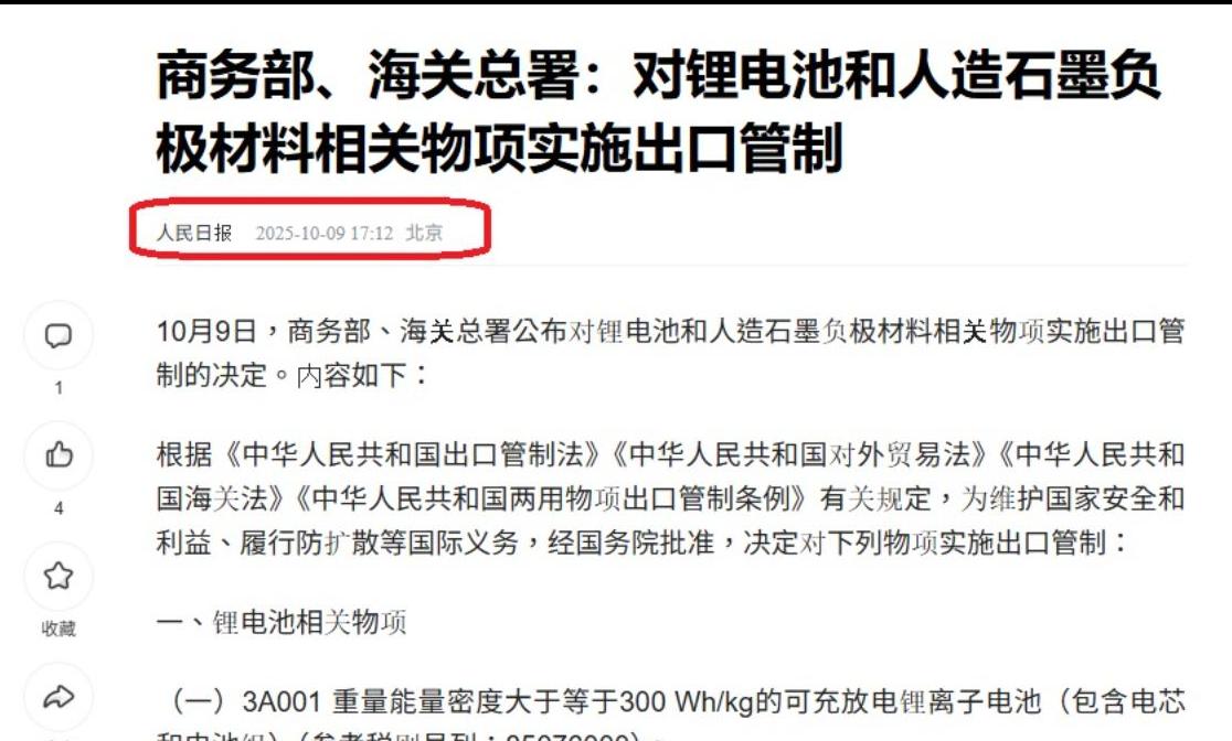 中國商務部與海關總署於10月9日晚間宣布,對高能量密度鋰電池及相關製造設備實施出口管制,引發全球電池供應鏈警戒。根據公告,凡重量能量密度達300 Wh/kg以上的可充放電鋰離子電池(含電芯與電池組),以及製造此類電池的設備,均列入出口管制清單。此舉被解讀為中國在全球新能源競爭中祭出的戰略性反制,不僅可能推升電池芯價格,也將加速各國尋求「去紅色供應鏈」的替代方案。