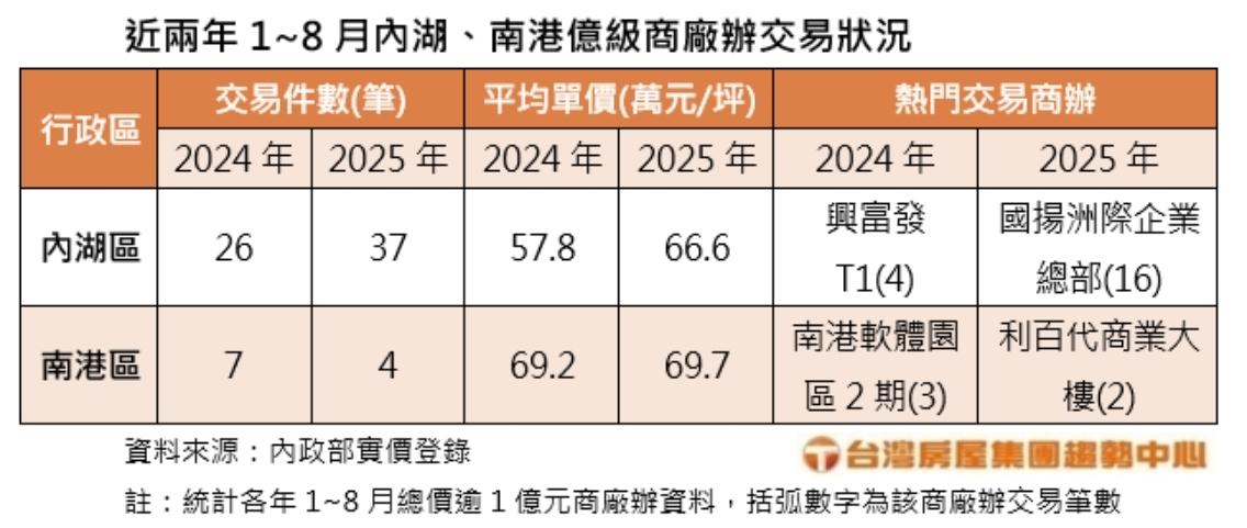 台灣房屋集團趨勢中心進一步統計,近兩年1~8月內湖及南港的億級商廠辦交易狀況,內湖今年成交37筆,較去年增加11筆;南港則自去年的7筆減至4筆,交易量略顯降溫。其中今年內湖最受矚目的為「國揚洲際企業總部」,單案即貢獻16筆交易,成為推升成交量的主力。南港則以「利百代商業大樓」為代表,今年成交2筆。