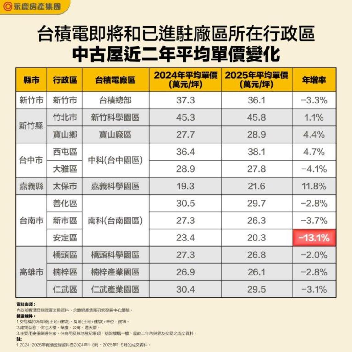 台積宅除了交易量明顯量縮外,部分區域房價也開始有所修正。陳金萍說明,南科台南園區近年來房價快速上漲,使不少購屋族已無法負荷,且該園區周遭房屋供給量大,隨著政策影響持續,不少投資客選擇退場轉售,使待售房屋供給增加。而且當地的交通、生活機能尚待完善,房價支撐性不足。數據顯示,安定區房價較去年共下修13.1%最高;新市區和善化區,房價也分別修正3.7%和2.8%。