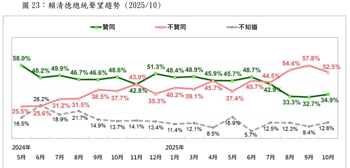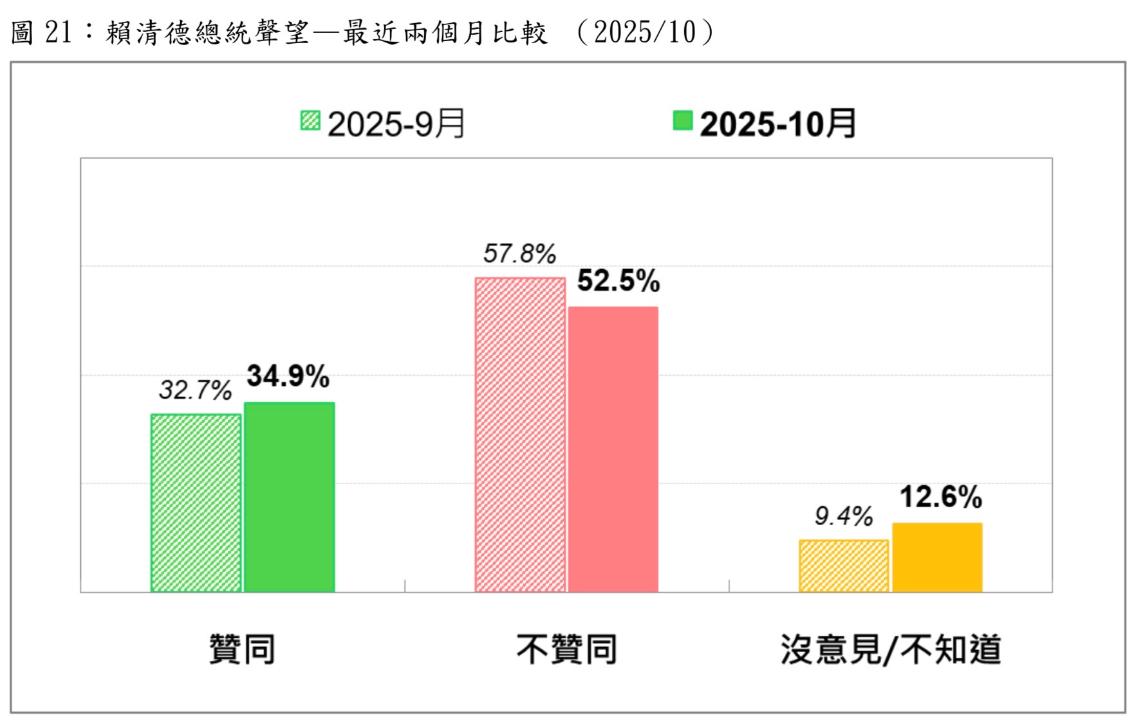 台灣民意基金會今(21)日公布10月最新民調指出,國人對於總統賴清德處理國家大政,有三成五贊同,但有近五成三不贊同,不贊同還多出17.6%,雖然與上個月相比已有稍微回升,但顯示雙十國慶激昂演說後,仍深陷執政困境中。