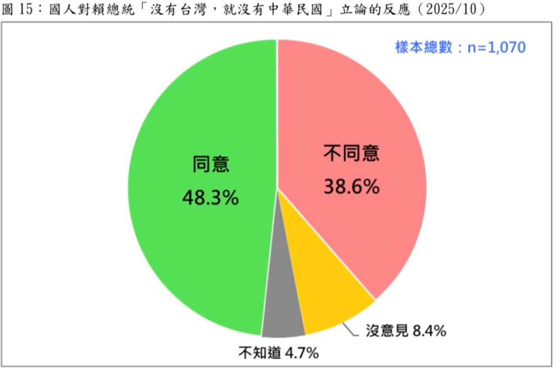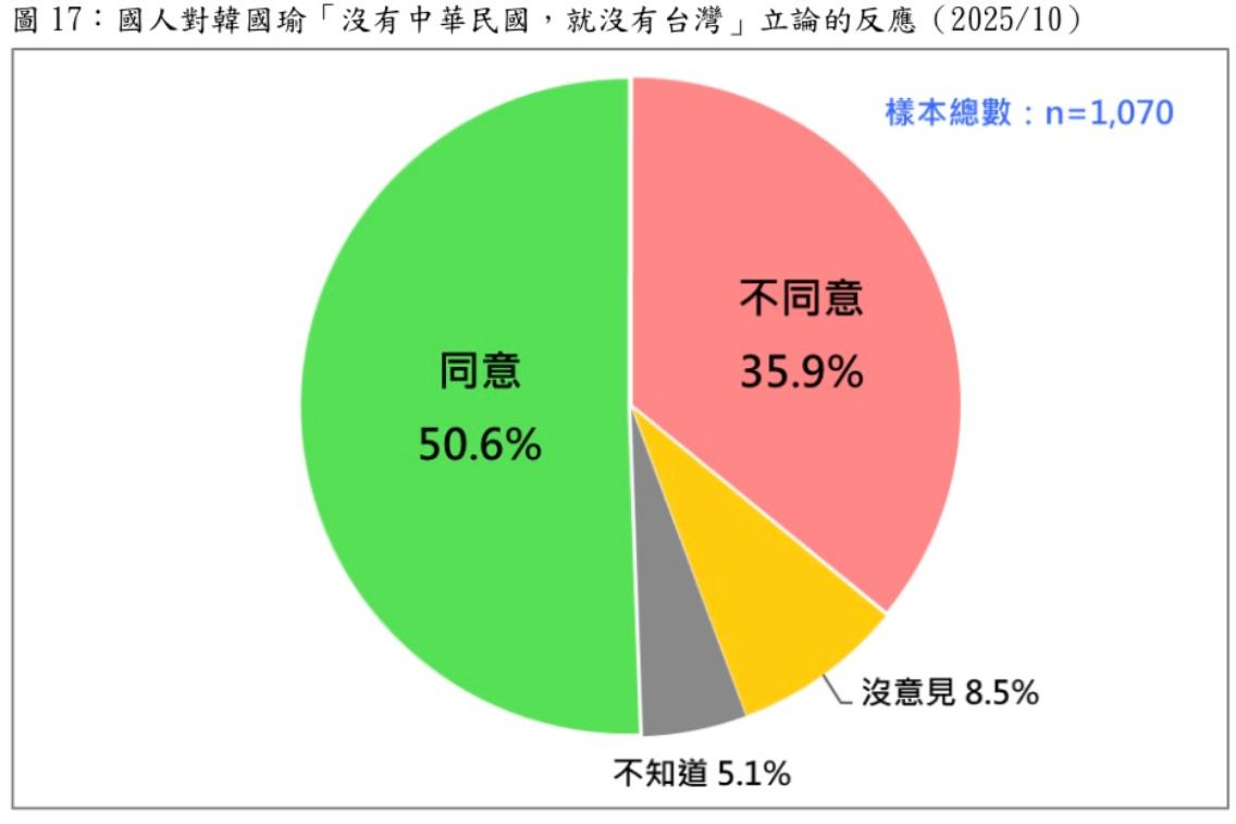 有趣的是,民調也將賴清德在在國慶晚會說:「沒有台灣,就沒有中華民國」,立法院長韓國瑜在雙十國慶說:「沒有中華民國,就沒有台灣」拿來對比。