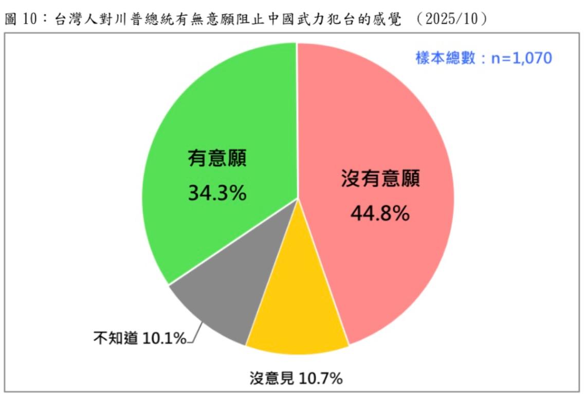 整體而言,三成四民眾,基本上覺得川普有意願,四成五覺得他並沒有意願。此刻台灣正興起一股悲觀的氣息,多數台灣人不感覺川普有意願阻止中國武力犯台,即使中國軍事威脅與日俱增,這種深層憂慮的出現,隱含對美國信心的動搖,值得關注。