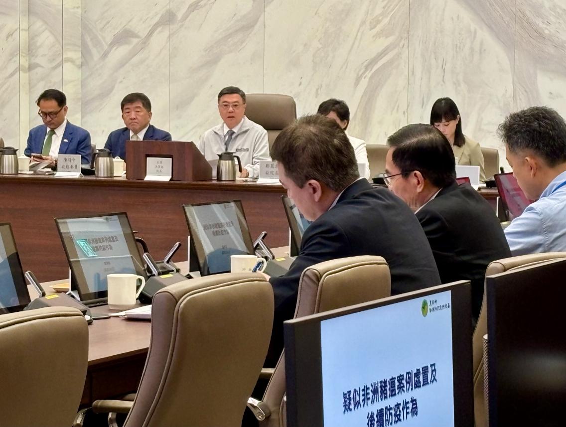 卓榮泰主持應變會議時重申上述4點裁示並表示,已向國際通報此一疫情狀況,並且要求各部會以最高標準防止疫情擴散,第一時間尤其要加強查緝走私和檢驗頻率,進行損害控管。