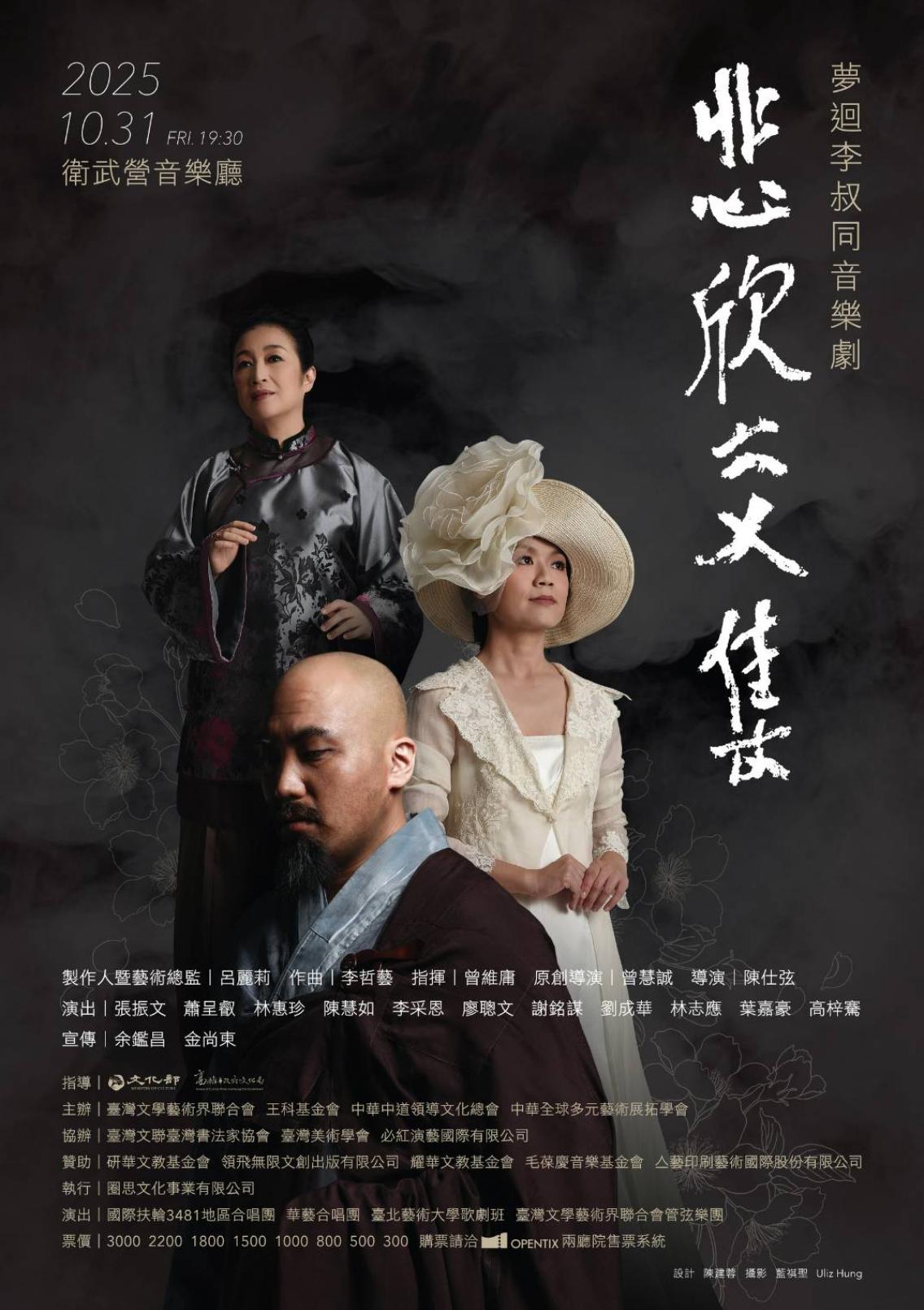 如今,應觀眾們的熱烈要求,台灣文學藝術界聯合會樂團、聲樂家及合唱團原班人馬將於2025年10月31日再度於高雄衛武營國家藝術文化中心音樂廳獻上兩場《悲欣交集》夢迴李叔同音樂劇的精彩演出。屆時,他們將以音樂劇的形式再次傳遞李叔同的大愛精神,將文化藝術的正能量帶給台灣的觀衆朋友們。