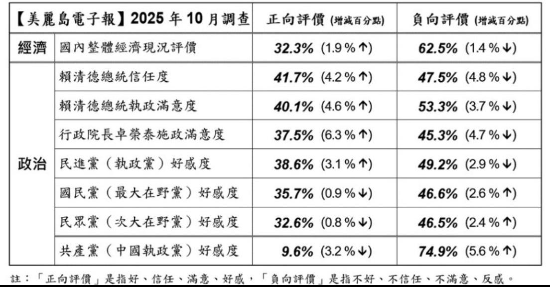 《美麗島電子報》公布10月國政民調,總統賴清德信任度和滿意度雙雙提升,在信任度部分,賴清德獲得受訪者41.7% 的正向評價,比上個月增加4.2%,是一個超過誤差範圍的增加,執政滿意度也增加超過4% 以上,來到40.1%。