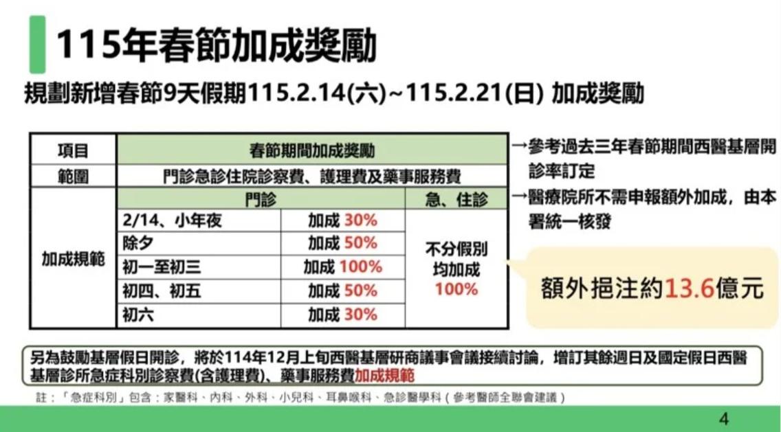 為紓解長假期間急診壅塞,並體恤春節上班的醫護人員,衛福部宣布自明年春節9天連假(2月14日至22日)起,首度針對醫院與基層診所實施健保給付加成,住院與急診項目將加成100%,門診依日期調整加成30%至100%不等。