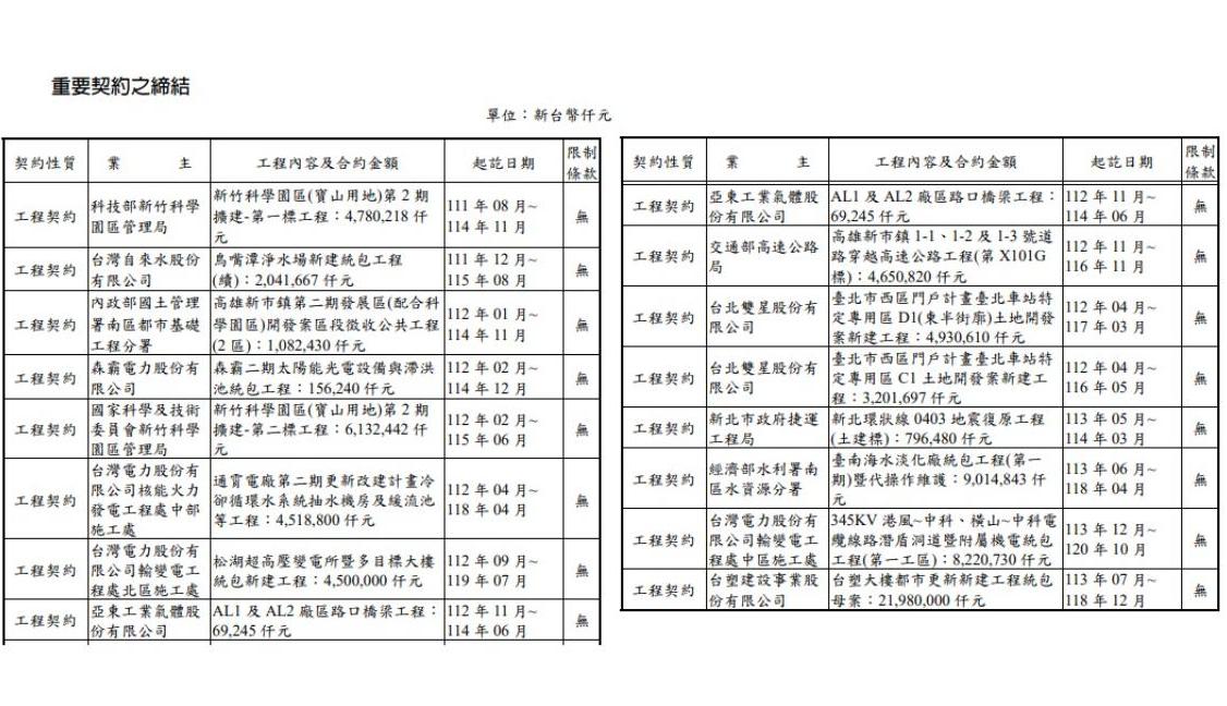 根據中工的財報,手上合約工程有219.8億元的台塑大樓都市更新新建工程統包,159億元的桃園捷運綠線 GM01 標機電、136.7億元的第一果菜(含堤內中繼)及萬大魚類批發市場改建案、112.9億元捷運綠線 GC02 標南出土段至G07站案、92億元的烏溪鳥嘴潭人工湖工程計畫、90億元台南海水淡化廠案。