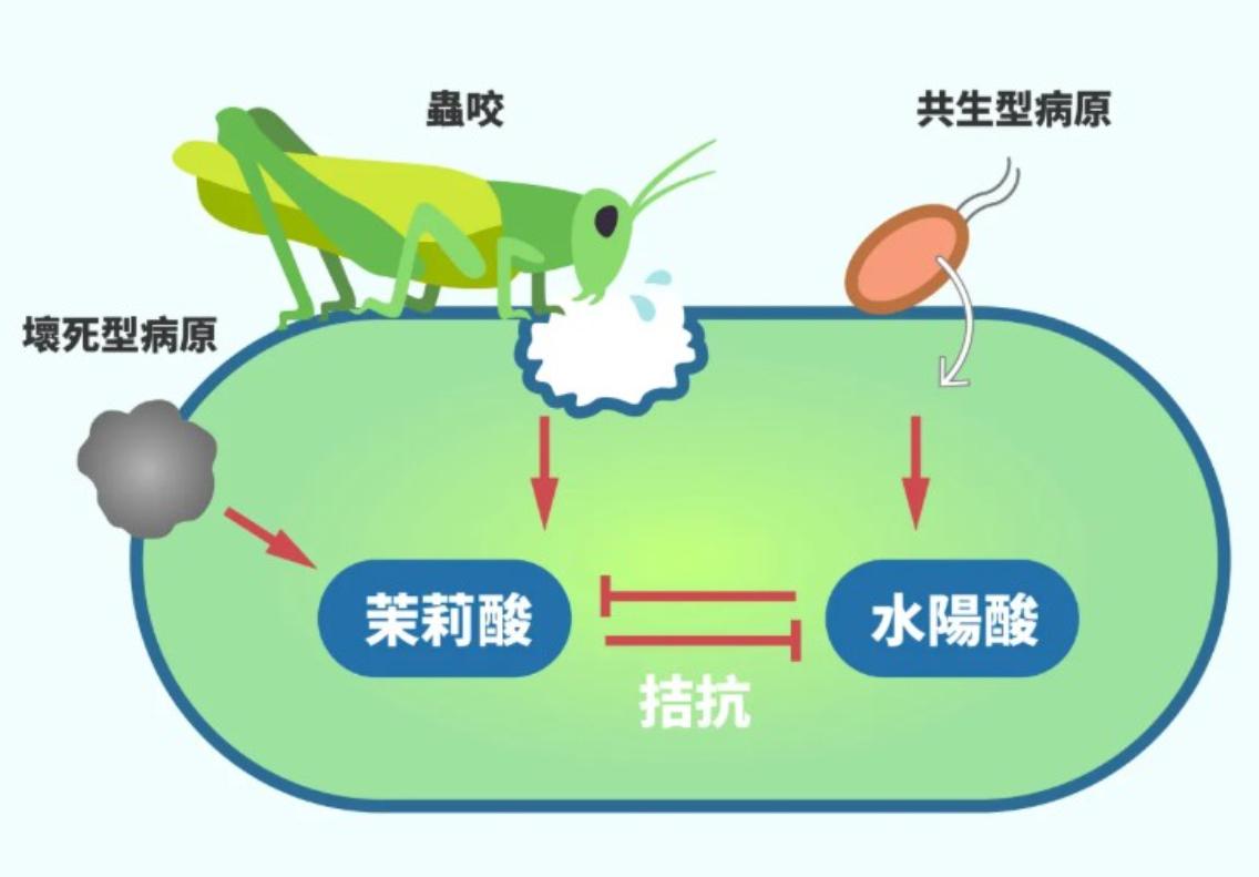 陳逸然指出,植物免疫系統目前主要區分為:水楊酸機制與茉莉酸機制,水楊酸機制專門對付細菌、病毒等共生營養型病原危害;茉莉酸機制則針對蟲咬以及壞死營養型等病原體的防禦。有趣的是,這兩種免疫反應在植物中有「拮抗」的現象,水楊酸濃度過高時,會抑制茉莉酸機制;反之亦然,植物能根據病原特性,靈活調整防禦策略。
