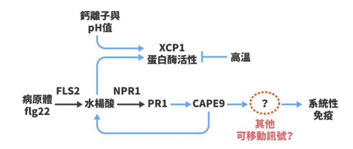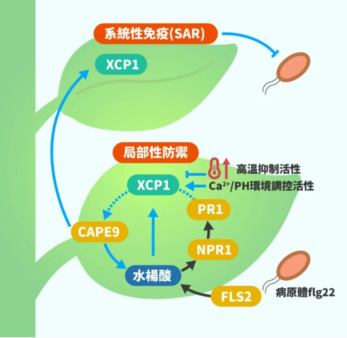 XCP1 這個蛋白酶,專門切割 PR1 蛋白,產生免疫信使 CAPE9。然而,XCP1 的活性受到外界環境條件的高度調控,最適合 XCP1 發揮功能的溫度,恰好是 22°C,也是最適合阿拉伯芥生長的環境溫度。當氣候變遷導致環境溫度升高,XCP1 的活性便會下降,植物的免疫反應能力會變差。