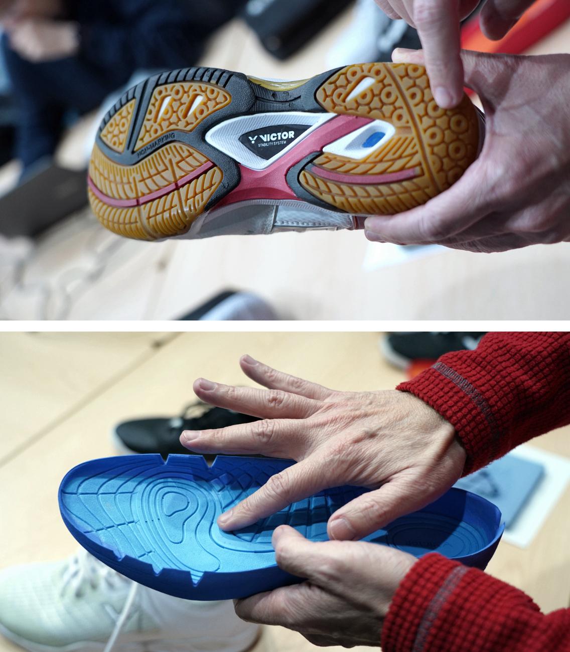 「過去的鞋面大多是皮或布製,現在則有更多種材料可供選擇,甚至可以抽換中底。」相子元一邊示範從鞋內將厚實中底抽出,一邊說道:「鞋子最容易磨耗的往往是中底,在鞋面、鞋底完好的狀況下,透過中底直接拔出換新的做法,讓羽球鞋的使用壽命增長。」除此之外,如今編織技術成熟,鞋面的包覆力、透氣性,都比以前更優秀,整體重量也更輕,保護雙腳的強度也就更卓越了。