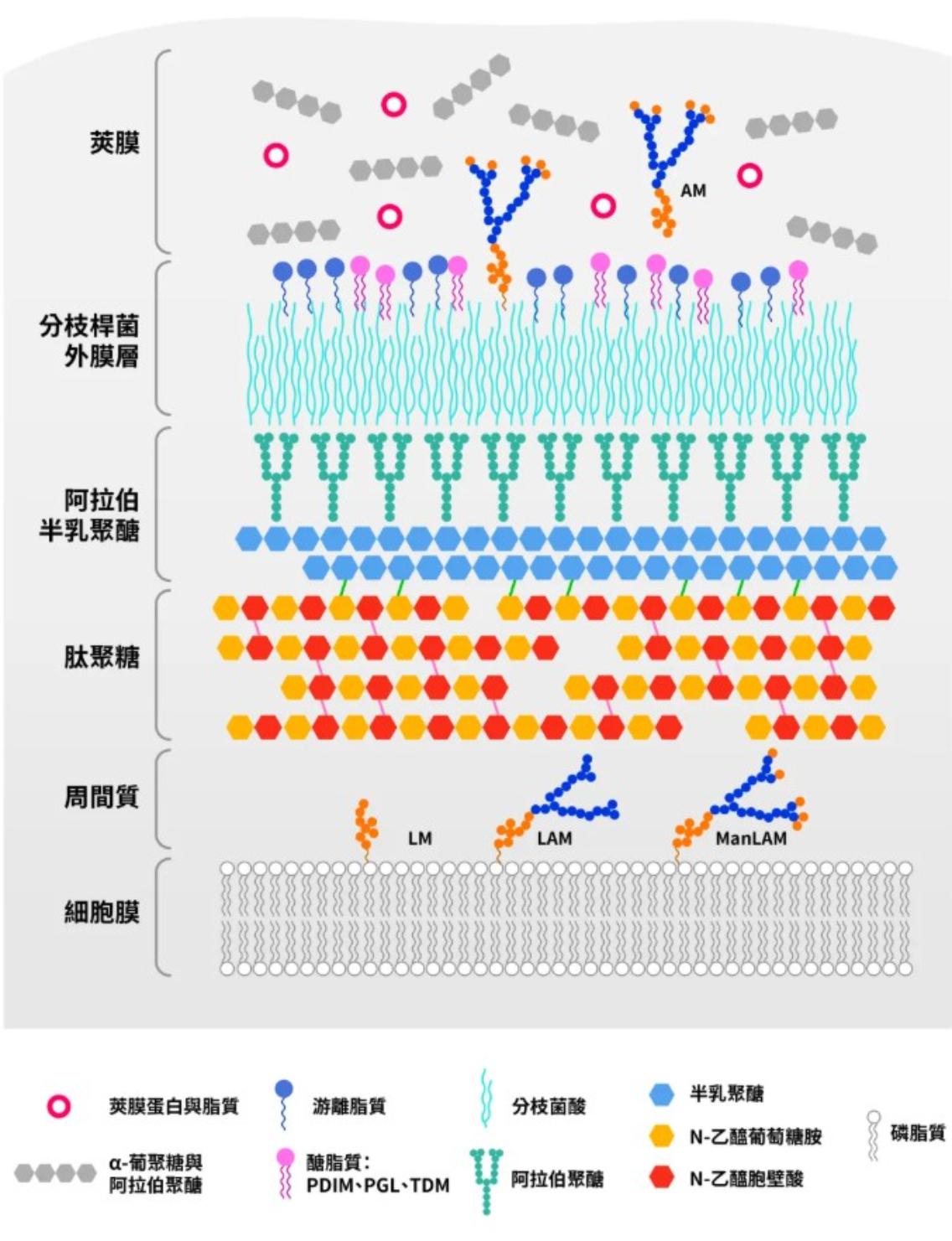 而結核病棘手的原因,有一部分正是來自其分枝桿菌的細胞壁——厚實的多醣結構。