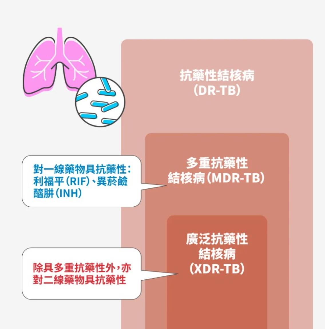 多重抗藥性結核病,指的是對一線藥物(異菸鹼醯肼、利福平)產生抗藥性;廣泛抗藥性結核病,除了具備多重抗藥性,對二線抗結核藥物也同樣具有抗藥性。