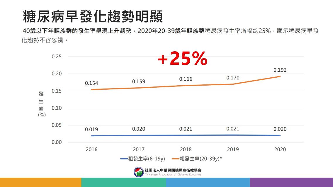 根據年鑑統計,2020年台灣20至39歲年輕族群的糖尿病發生率明顯上升,5年間增幅達25%。