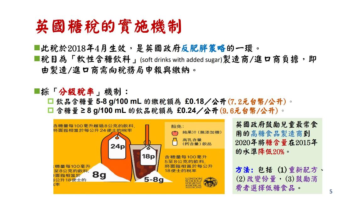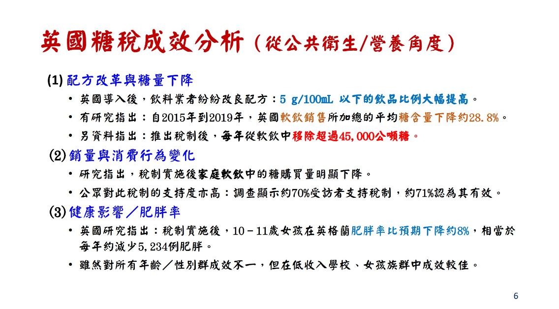 針對糖尿病年輕化的根本原因,糖尿病衛教學會監事、營養師歐陽鍾美在「減糖行動倡議」簡報中指出,全球多國透過「糖稅」與「標示制度」成功減少含糖飲料攝取量。例如英國自2018年推行軟性飲料稅後,飲品糖含量下降近3成,兒童肥胖率也明顯下降;墨西哥與南非實施糖稅後,含糖飲料購買量分別減少約37%與19%。