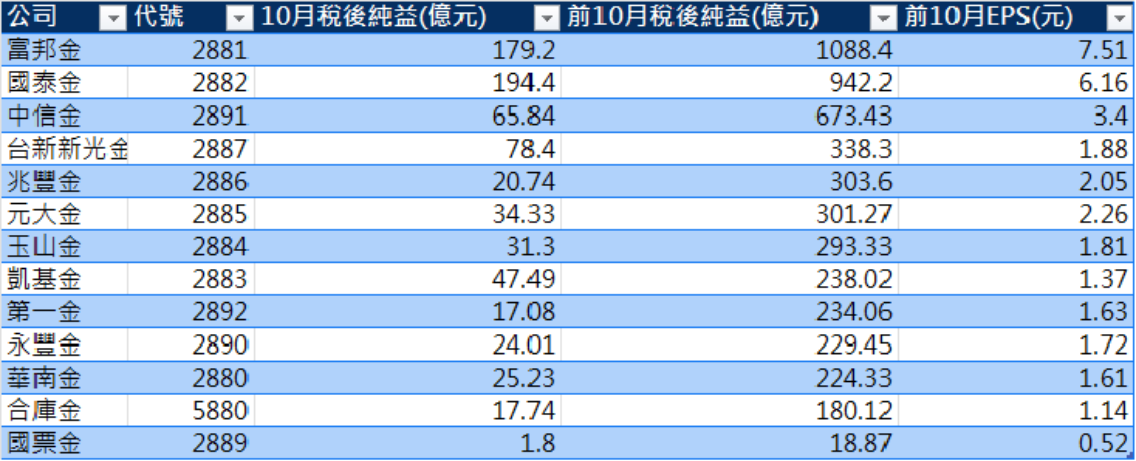若從商業模式切分,壽險比重高的富邦金、國泰金與台新新光金,這一波明顯受惠股債行情回升,10月壽險資本利得與金融資產評價回沖,是拉高單月獲利的關鍵。