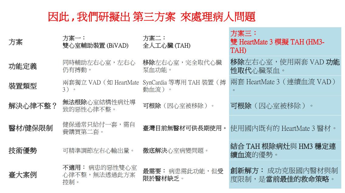 在國內尚無全人工心臟(TAH)醫材、健保又僅給付一套輔助器的限制下,團隊決定採取前所未有的策略—移除壞死心室,植入兩套長效型輔助器分別取代左右心功能。