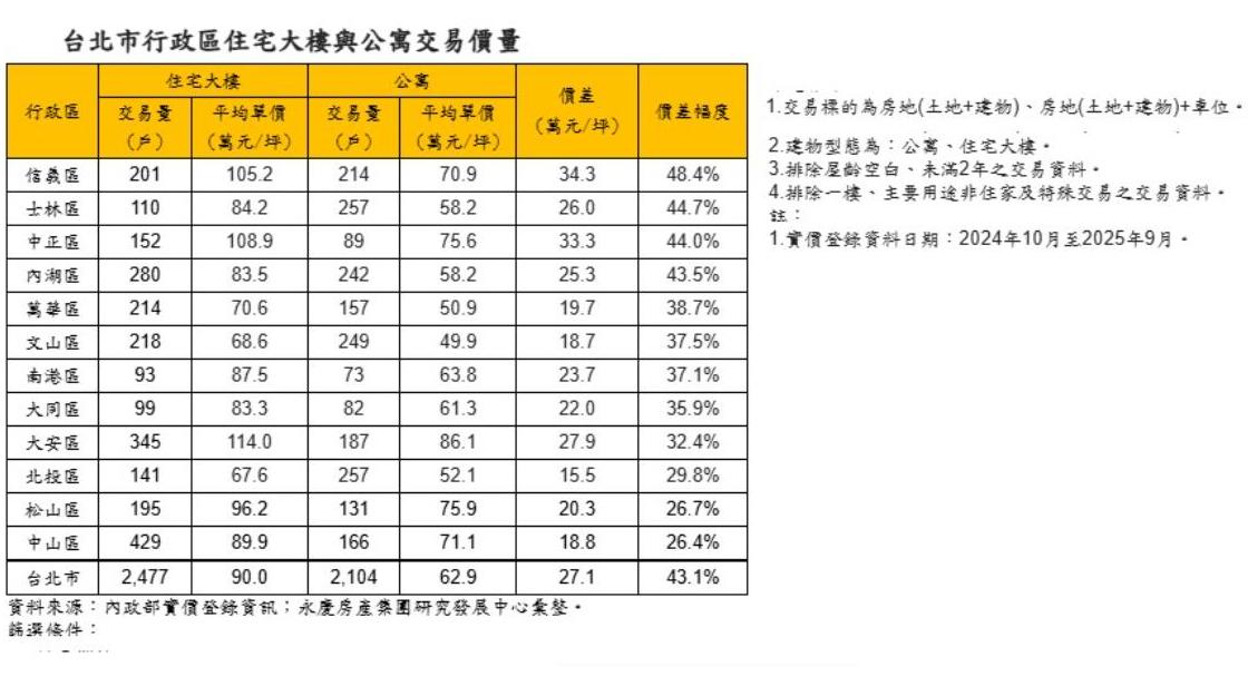 大樓、公寓價差幅度逾四成 信義、士林公寓性價比更高
