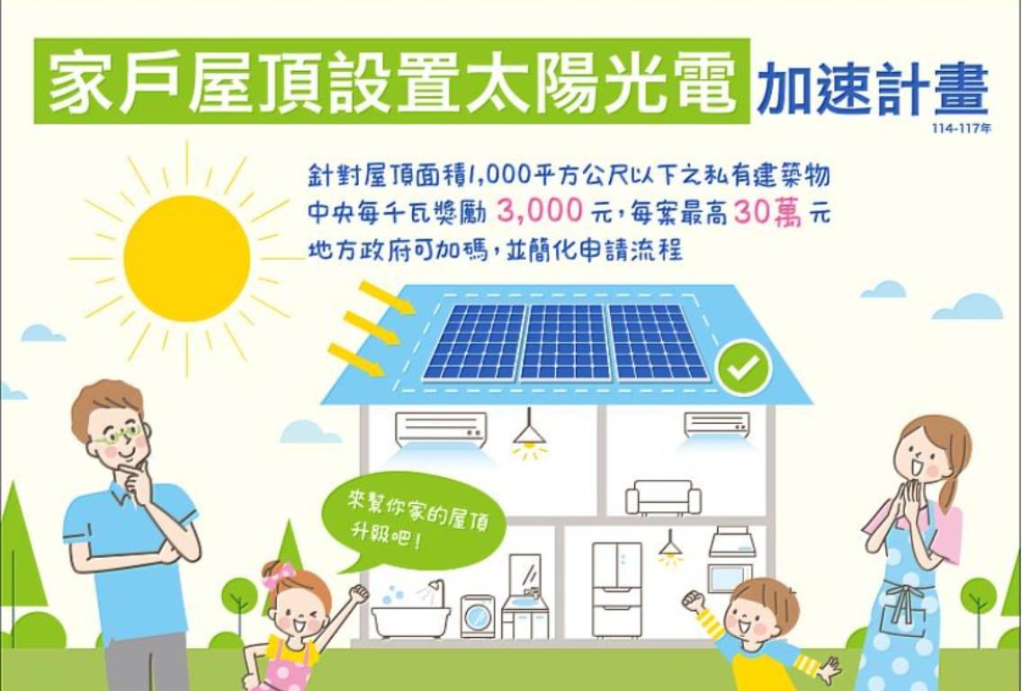 經濟部為⿎勵地⽅家⼾設置太陽光電,提升設置比例,訂定「經濟部補助直轄市及縣(市)政府辦理家⼾屋頂設置太陽光電加速計畫審查作業要點」,期望透過獎勵降低成本⾨檻,提升⼩型案場設置意願,使屋頂型光電持續成為再⽣能源發展之主⼒。
