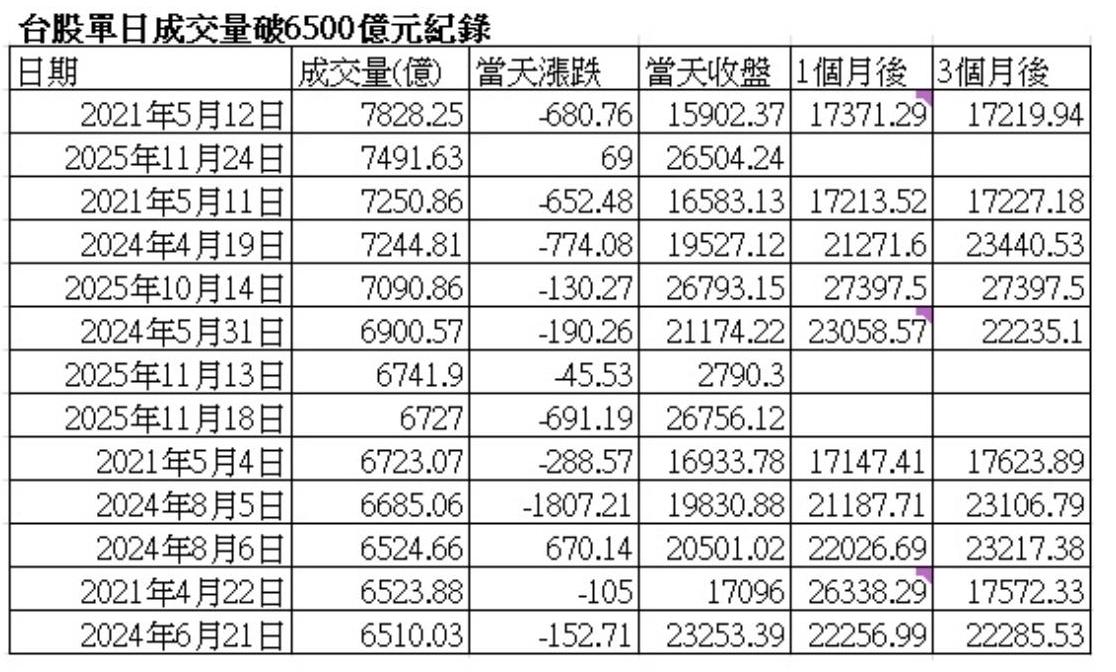 台股成交量創歷史次高的7491億元,是否具有什麼意義呢?算是爆量不漲嗎?以下統計過去20年來台股單日成交量超過6500億元以上的前10大成交量紀錄,可以發現在2021年5月12日、5月11日和2024年4月19日,幾乎當天台股爆大量,而且當天通常是下跌的情況下,三個月後幾乎都是大漲,當然,不保證這次台股爆出大量後也會大漲,就由資本市場的態度決定。
