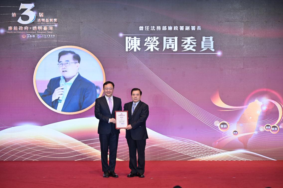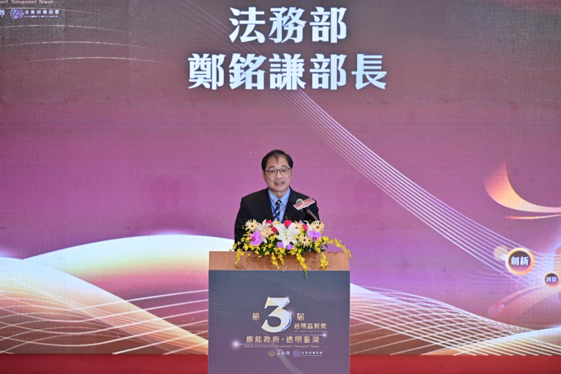 第3屆「透明晶質獎」頒獎典禮於114年11月25日假國家圖書館國際會議廳舉辦,賴清德總統特別透過賀電向所有獲獎者表達誠摯的嘉佩之意,並希冀藉由「透明晶質獎」鼓勵公部門精進廉能創新作為,樹立標竿學習典範,帶動落實良善治理,共同提升國家競爭力。頒獎典禮中由本部鄭銘謙部長致詞並頒發獎座及獎狀予6個獲獎機關代表,另由廉政署馮署長頒發感謝狀予評選委員,透過溫馨又隆重的表揚典禮,向所有獲獎機關及評選委員表達肯定與感謝。