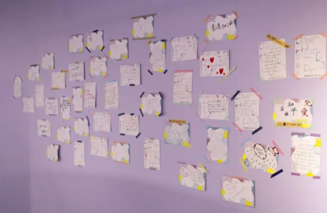 步出展場前,身旁的牆面上貼著許多觀眾留下的觀展感想,當中包含對整起事件的反思、個人經驗的分享,或是想與這群社運抗爭者說的話。這是彭仁郁對來訪者的邀請,透過收集眾人的反饋,一起創造更多交互敘事和理解的可能。