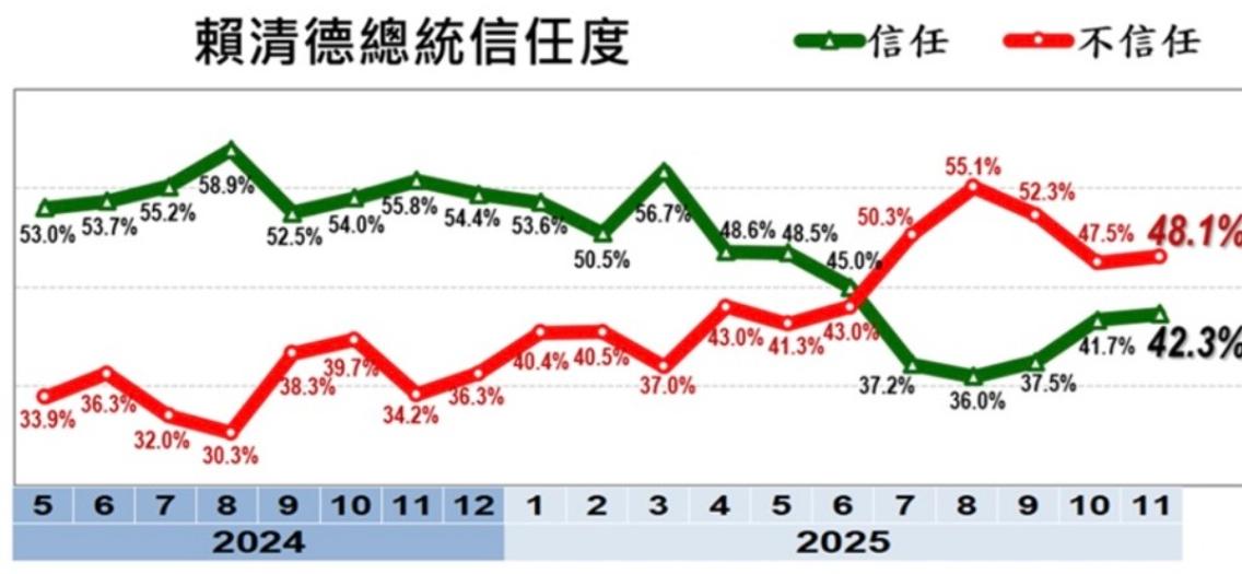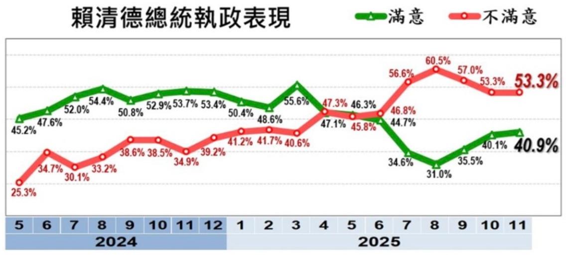 《美麗島電子報》今(1)日公布11月國政民調指出,總統賴清德的滿意度為40.9%,不滿意度則維持53.3%,滿意度連續3次上升但不滿意已經連續5個月超過半數。而信任度方面有42.3%表示信任,48.1%不信任,顯示相當分歧。