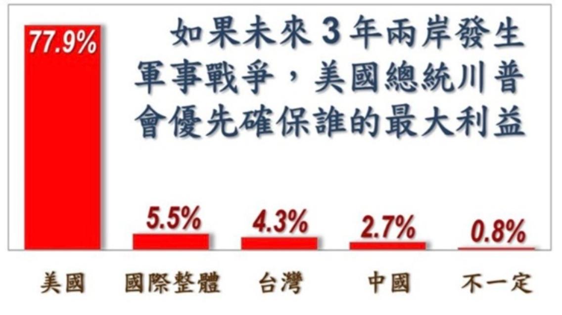 民調另詢問,未來3年兩岸如果發生戰爭,美國總統川普會優先確保誰的最大利益?結果美國為77.9%,國際整體為5.5%,優先確保台灣利益只排第三名的4.3%,甚至是中國利益也有2.7%。