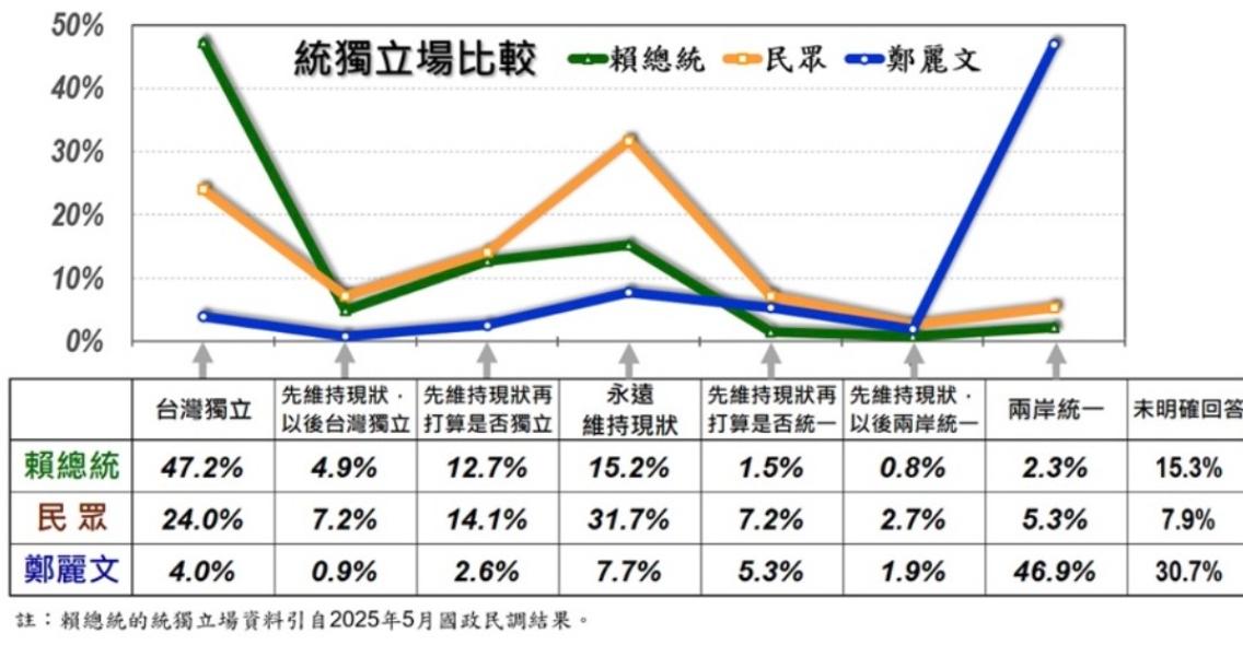 民調稱,就民眾認知的賴清德與鄭麗文統獨立場而言,顯然在民眾心中2人都迥異於主流民意對台灣前途的立場。
