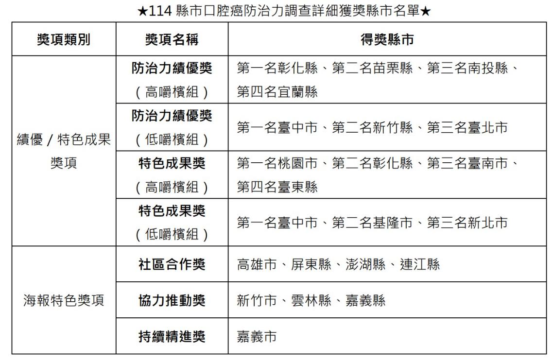 114年縣市口腔癌防治力調查結果公布:彰化、台中奪雙組第一