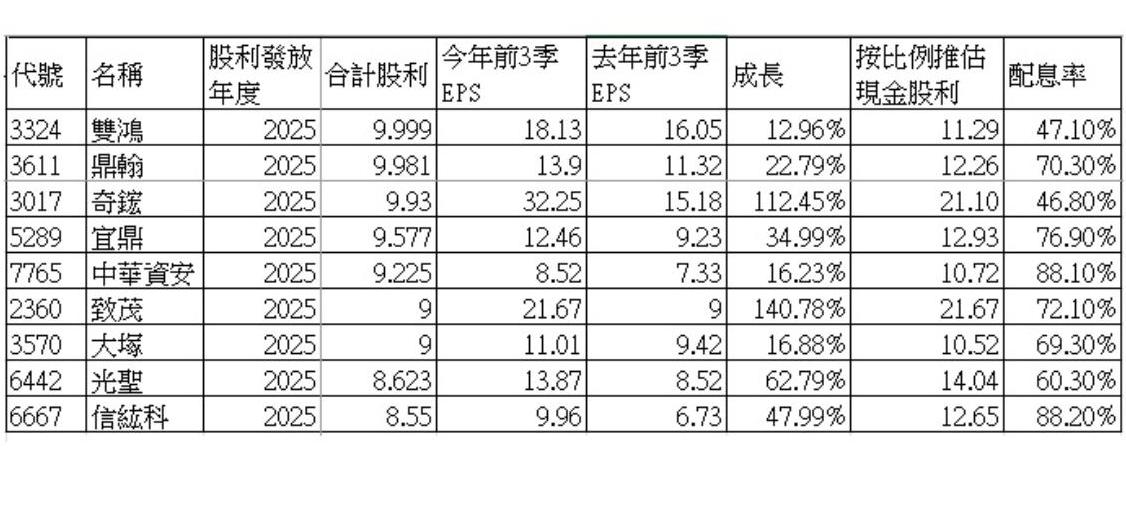 以獲利成長衡量,今年前三季奇鋐(3017)因AI伺服器散熱需求爆增,前三季營收已經918億元,創下歷史新高,前10個月營收已經超過1000億元,創下歷史新高,較去年同期成長87%,前三季每股盈餘32.25元,是去年同期15.18元的1.12倍,今年配息去年的盈餘發了9.93元,明年將輕易的發超過10元,15元都有可能。
