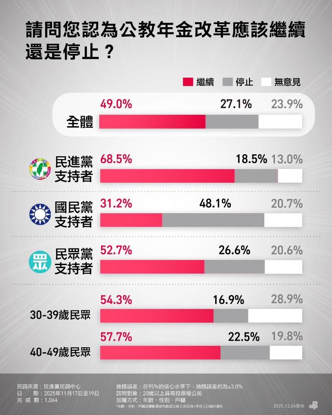 持繼續年金改革、18.5%反對,國民黨支持者有31.2%支持繼續年改革、48.1%反對,民眾黨支持者有52.7%支持繼續年金改革、26.6%反對。