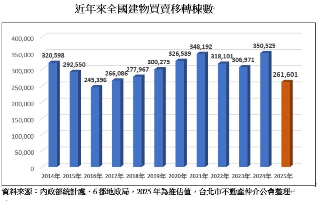 很快的2025年近尾聲,台北市不動產仲介公會根據6都最新發佈的前11個月房屋買賣移轉棟數推估,2025年全國全年房屋交易量大概會落在26萬1, 601棟上下,算是勉強守住26萬棟大關卡,與2024年35萬棟比較,大幅衰退了25.4%,交易量創下近9年來新低紀錄,蛇年房市可說是個「虎頭蛇尾」淒風苦雨冷清的一年,六都的交易量更是全線潰敗。