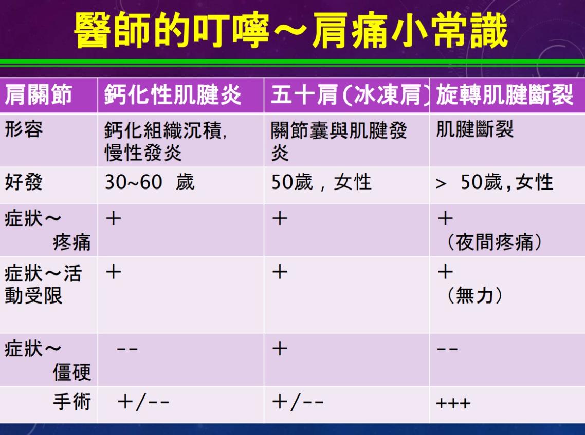 王小姐48歲,在一家貿易公司擔任行政主管。4個月前開始,她開始覺得右肩不適,一開始只是穿脫衣服時感覺卡卡的,後來連夜間睡覺翻身都會痛醒。她先到地方診所求醫,經X光與超音波檢查後診斷為肩旋轉肌腱鈣化性肌腱炎。