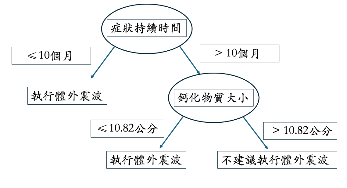 周文毅醫師說,結果顯示J48決策樹模型在預測治療後鈣化能否吸收完全之準確率高達89.5%,而XGBoost模型預測治療後疼痛與功能改善之準確率達到90%以上,可作為臨床治療決策前的重要依據。同時,症狀持續時間超過10個月、治療前疼痛指數(VAS)高於5分,以及功能指數(CMS)高於55分的患者,在治療後的改善幅度相對有限。這些發現可協助醫師針對不同患者制定更個人化的治療策略。