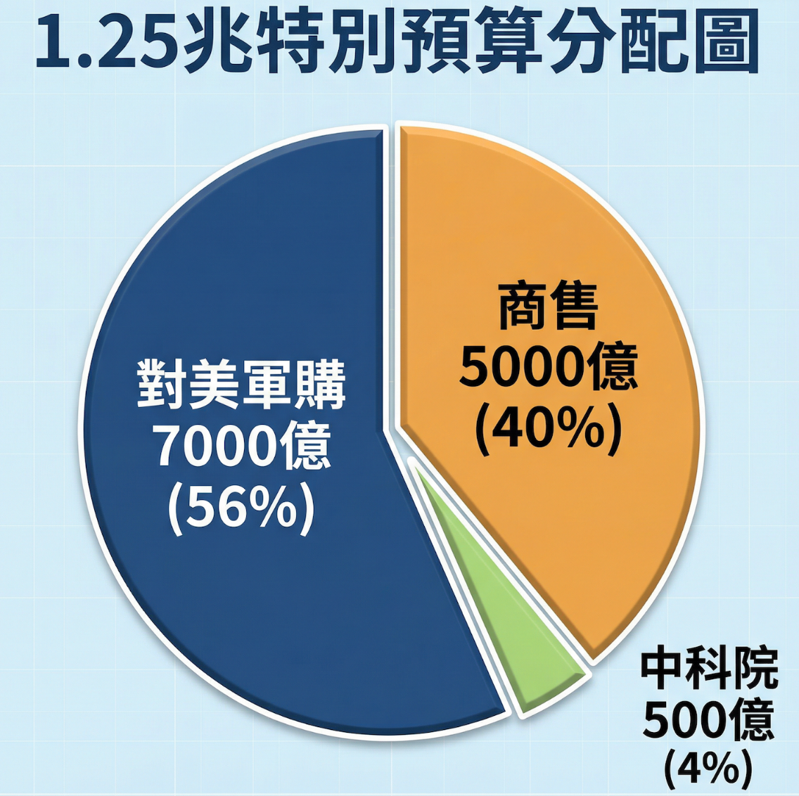 總統賴清德拋出1.25兆元的「強化防衛韌性及不對稱戰力計畫採購」特別條例,預算內容保密到家,知情人士透露,其中,初估約有7千億元是對美軍購為最大宗,5千億元為商售,國防自主重鎮的中科院分到約500億元為最少。