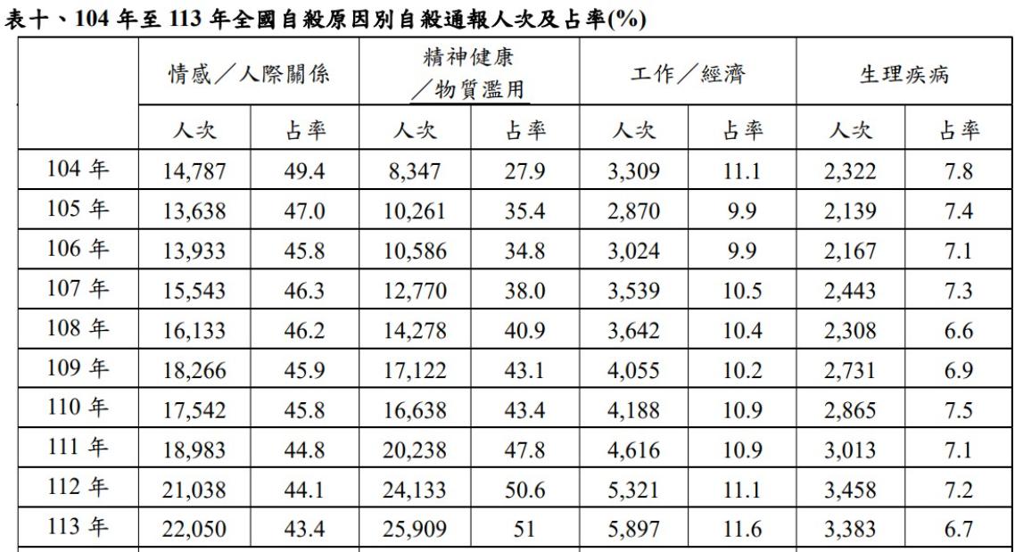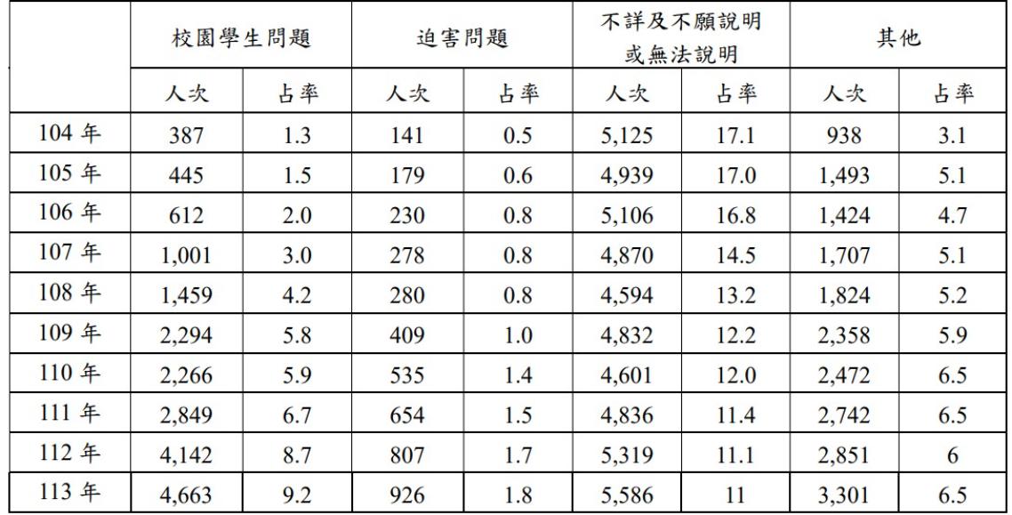 在通報原因方面,113年的數據顯示,精神健康或物質濫用問題占比最高(51%),其後是情感與人際關係壓力(43.4%)。值得注意的是,學校相關壓力的通報比例已達9.2%,相較10年前的1.3%,暴增近7倍。