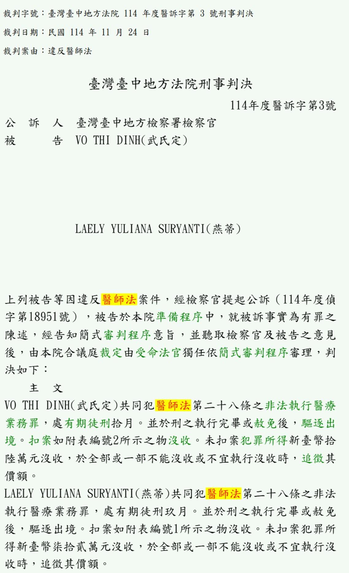 法院最終依「非法執行醫療業務罪」,分別判處9個月與10個月徒刑,並沒收違法所得與施術器材,兩人服刑後須被驅逐出境。