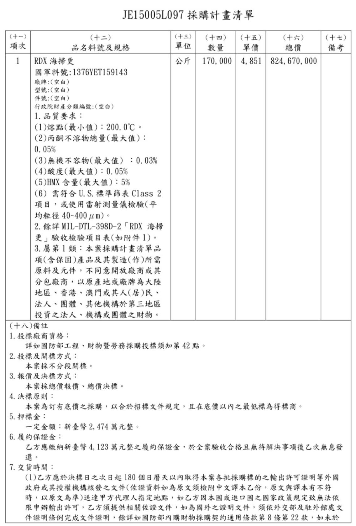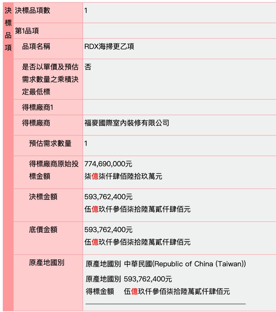 國防部1項預算金額達8億多元,決標金額5.9億元的「RDX海掃更」高效炸藥的標案,竟是由一家資本額僅1千多萬元的福麥國際室內裝修公司得標,引發網路炸鍋和質疑。