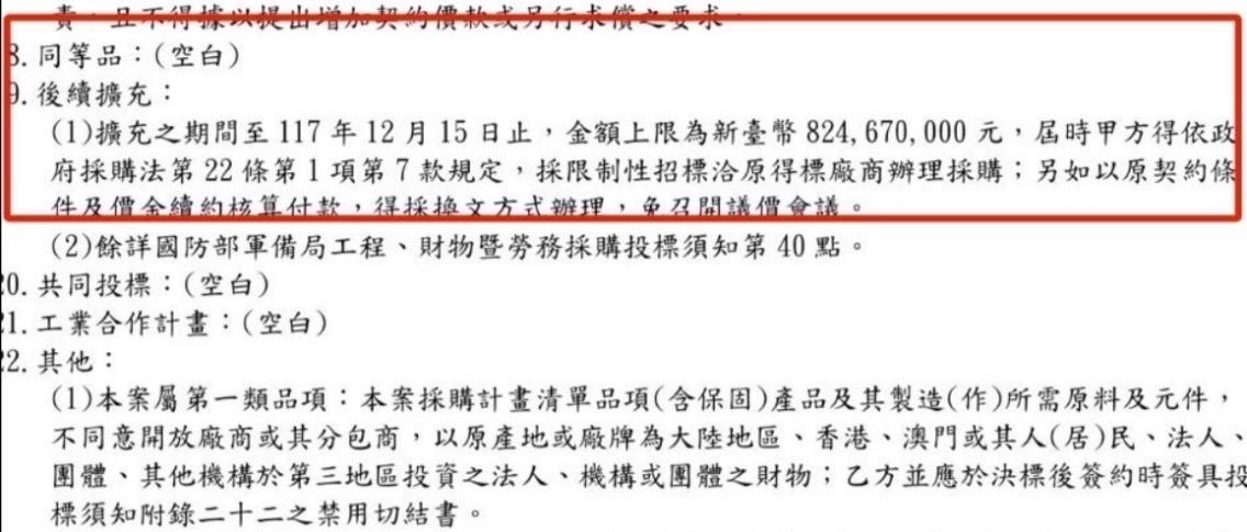專家稱,過去軍方為軍方自製,這次因為軍備局205廠彈藥需求翻倍而「首次外購」,如果採外購方式「一定翻倍賺」,且有列入附加條款,後續還是會採用限制性招標,可以再採購近9億元火藥標案的開口合約,等於是「一次性大開前後門」。