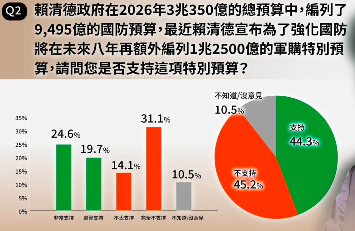 第二題是有關8年要編列1.25兆元特別預算是否支持一事,不支持的有45.2%,完全不支持的比例31.1%為最高,支持為44.3%,非常支持為24.6%,顯見非常兩極。
