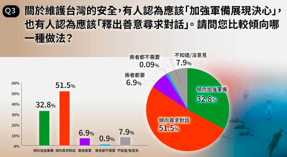 第三題為比較傾向「加強軍備展現決心」還是「釋出善意尋求對話」?民調顯示,逾半的51.5%傾向尋求對話,傾向加強軍備有32.8%。