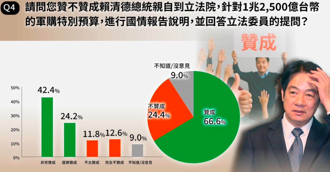 針對1.25兆國防特別預算,國民黨與民眾黨在今(12)日正式提案,邀請總統賴清德到立法院進行國情報告,民眾黨並公布最新民調顯示,有66.6%的民眾表達贊成,僅有24.4%表達不贊成。