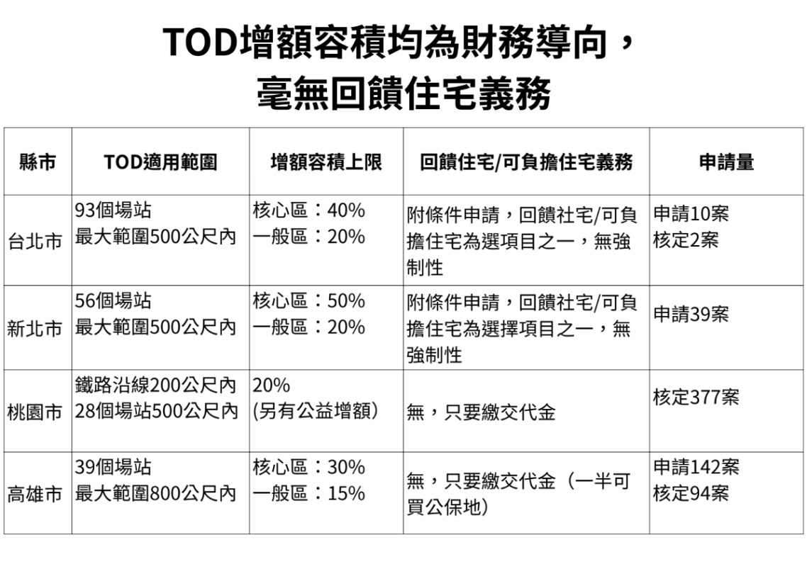 依民團提供資料,目前六都中已有北市、新北、桃園及高雄施行 TOD 增額容積制度,但增額容積多被地方視為創造財源的工具,普遍只要求開發商繳納代金,並未規定一定比例回饋社會住宅或可負擔住宅。