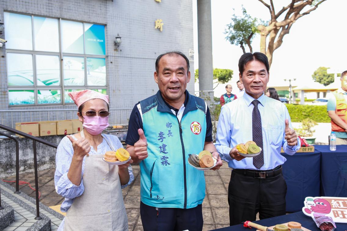 2025萬丹紅豆牛奶節暨跨年晚會由鄉長李建霖(中)協同馬卡龍紅豆餅品牌豆廚子創辦人王惠玲(左)發表超可愛IP紅豆餅,大玩文化創意結合在地美食。(圖片來源/萬丹鄉公所)